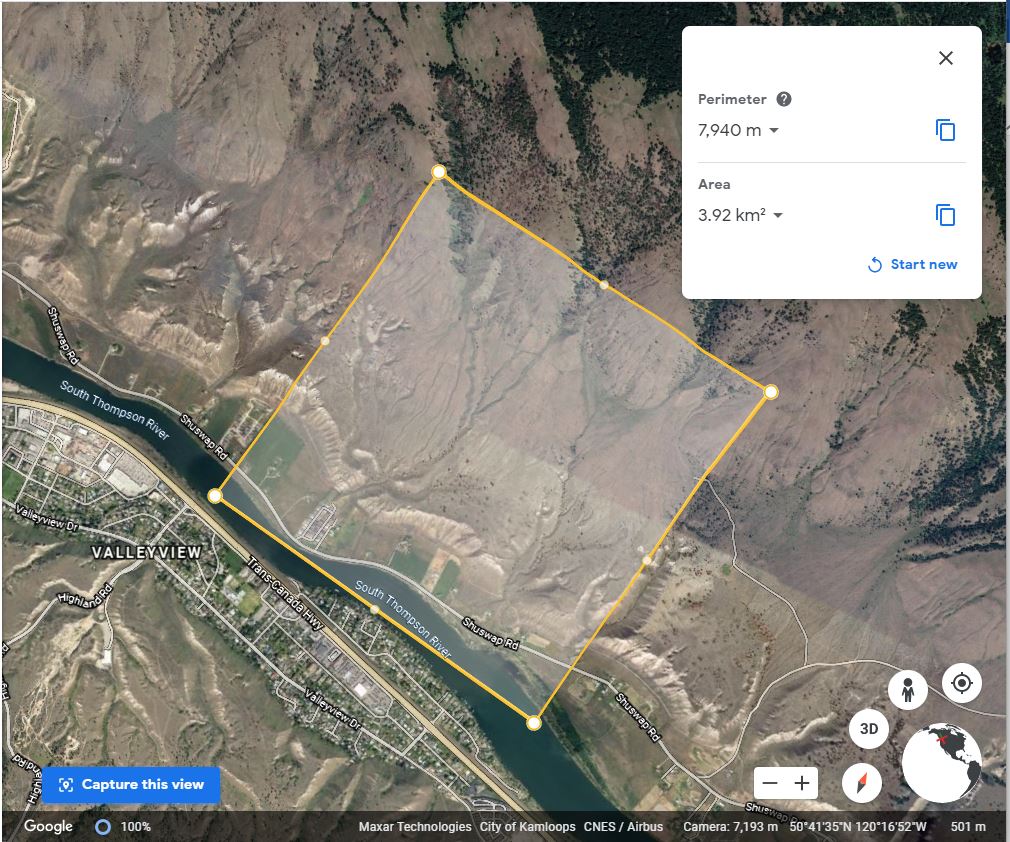 - Please construct figure 2 of your lab assignment by including a photograph of your study area. If you are using the same study area that you visited for lab 1, you may choose to revisit your study area to observe changes in the months since lab 1, or you may choose the photograph that you took in lab 1. If you do not have a personal photograph of the study area, please rotate the view in Google Earth of your study area in 3D view (button in lower right-hand corner). Then, by using the shift button, rotate the view in order to allow the viewer to understand the variations in slope and vegetation within your study area as well as the surrounding watershed. If you are using a personal photograph, draw on the photograph the approximate bounds of your study area.